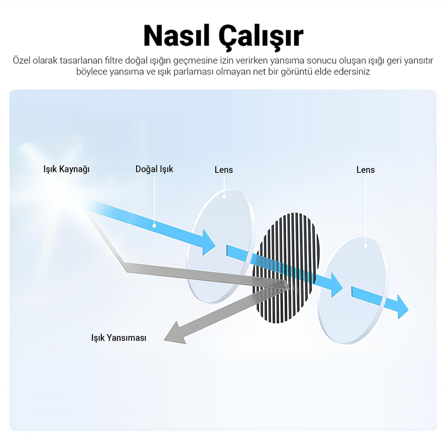 - Gündüz yansıma kontrolü: Cam yüzeylerinden, ıslak yollardan ve güneş ışığının direkt vurduğu yüzeylerden kaynaklanan polarize ışığı engelleyerek görüntüdeki beyaz perde etkisini ortadan kaldırır