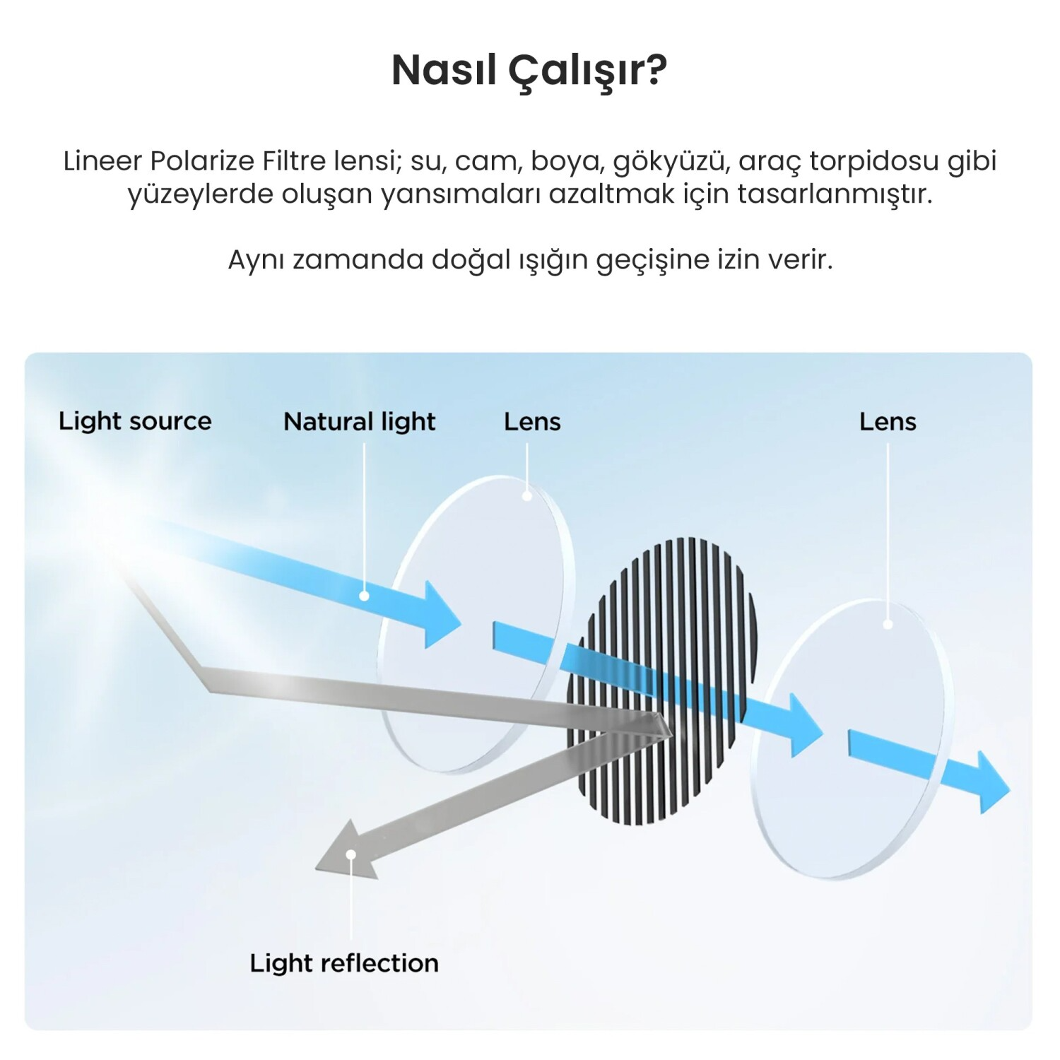 Lineer Polarize Filtre, cam ve yol yüzeylerinden gelen yansımaları ve parlamaları azaltarak görüntü netliği ve kontrastında belirgin bir iyileşme sağlar.
