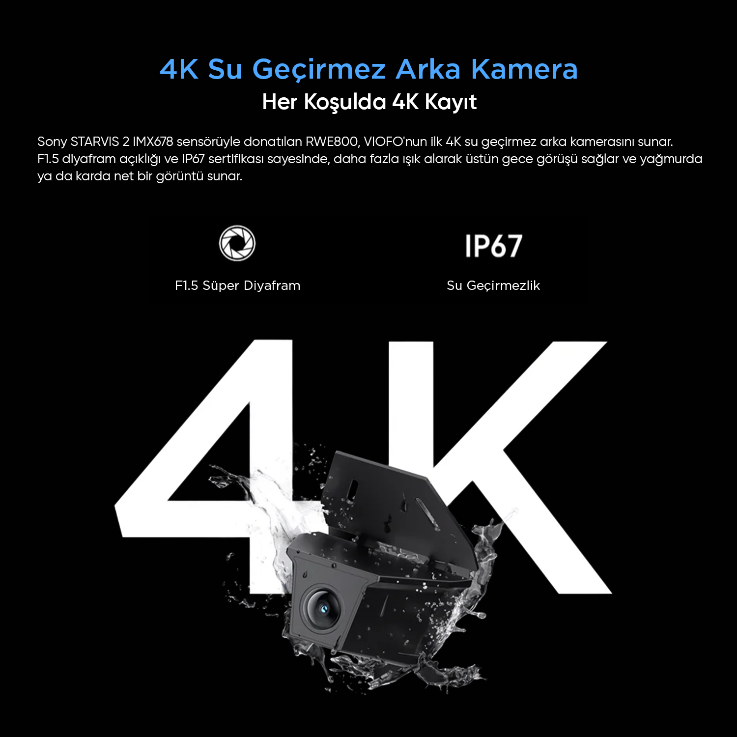 Sony STARVIS 2 IMX678 sensörüyle donatılan RWE800, VIOFO'nun ilk 4K su geçirmez arka kamerasını sunar. F1.5 diyafram açıklığı ve IP67 sertifikası sayesinde, daha fazla ışık alarak üstün gece görüşü sağlar ve yağmurda ya da karda net bir görüntü sunar.