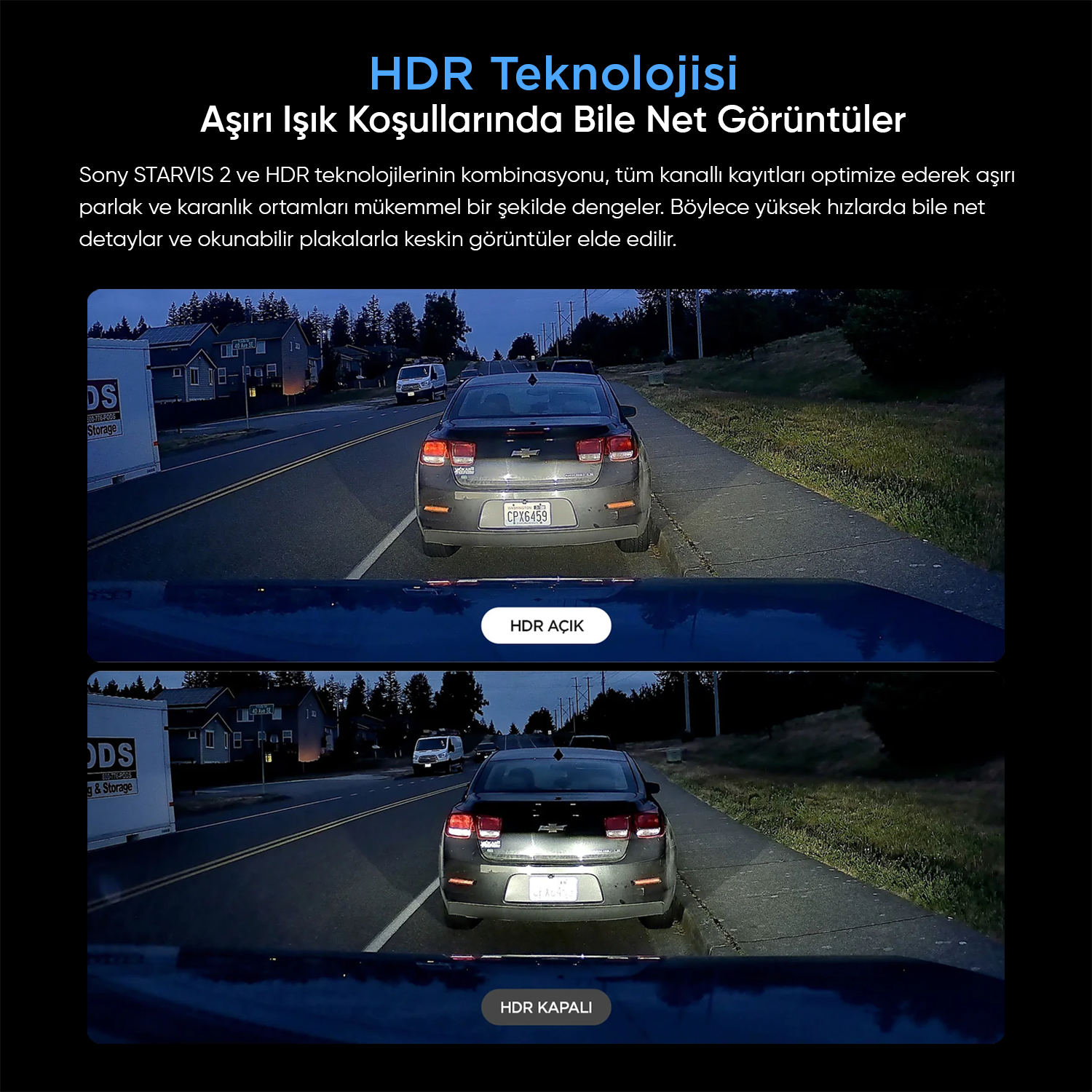Sony STARVIS 2 ve HDR teknolojilerinin kombinasyonu, kayıtları optimize ederek aşırı parlak ve karanlık ortamları mükemmel bir şekilde dengeler. Böylece yüksek hızlarda bile net detaylar ve okunabilir plakalarla keskin görüntüler elde edilir.