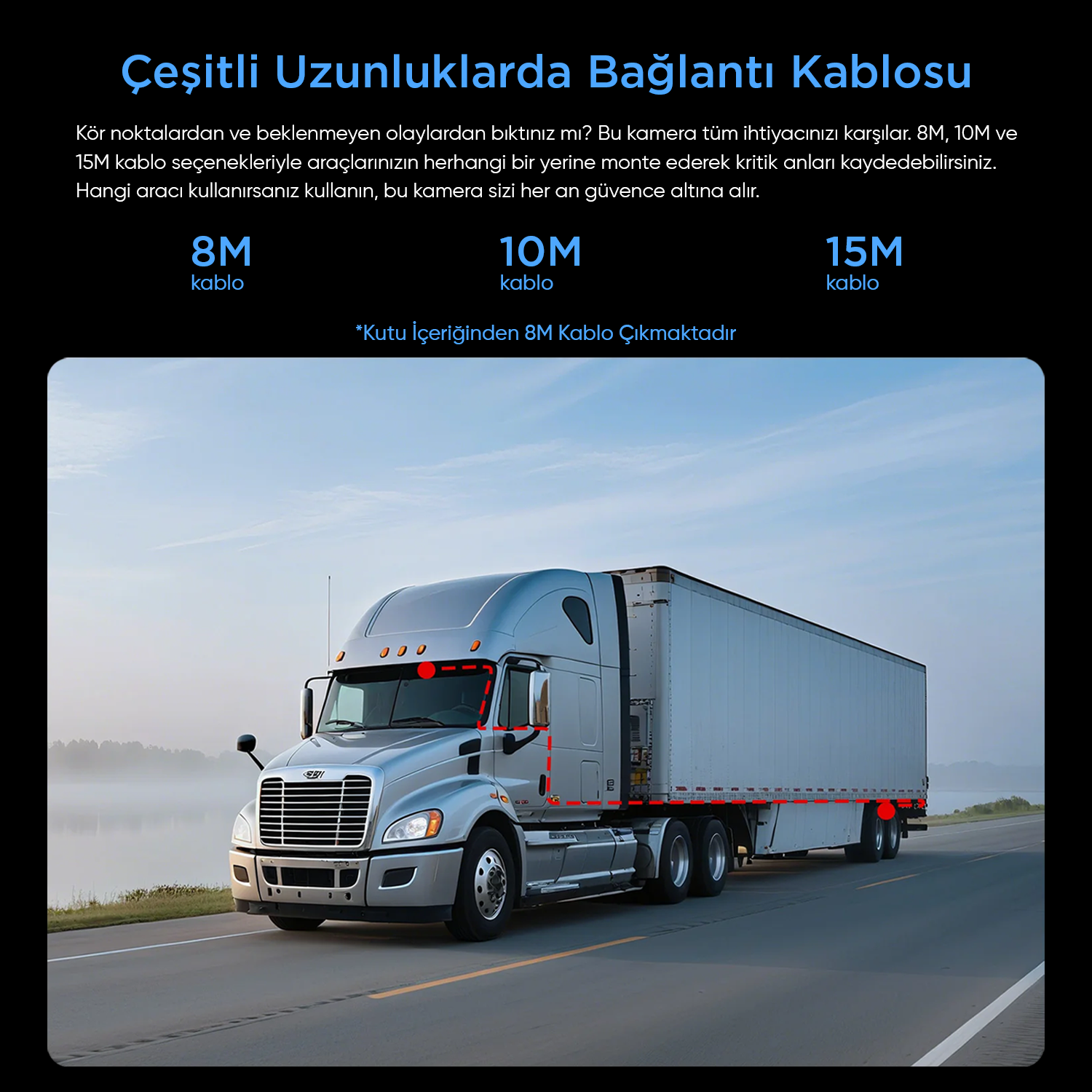 Kör noktalar ve beklenmedik olaylarla mı mücadele ediyorsunuz? Kamera her zaman sizinle. 8 m, 10 m ve 15 m uzunluğundaki kablo seçenekleriyle aracı nerede isterseniz oraya monte edebilirsiniz. Özellikle kamyon ve römork sürücüleri için, kamera sizi her an güvence altına alır.