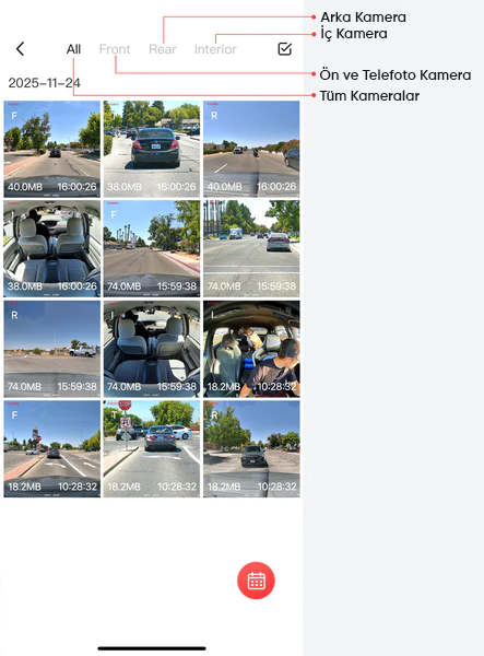 SD kart dosyalarını yönetin; klipleri doğrudan uygulamadan indirin, silin veya paylaşın.