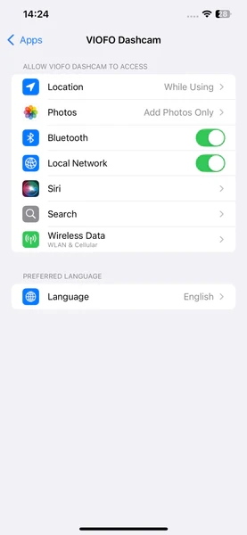 Ayarlar > VIOFO Dashcam yolunu izleyin ve Konum, Fotoğraflar, Bluetooth, Yerel Ağ ve Kablosuz Veri dahil olmak üzere gerekli izinlerin etkinleştirildiğinden emin olun. Doğru izinler, uygulamanın düzgün bağlanmasını ve çalışmasını sağlar.